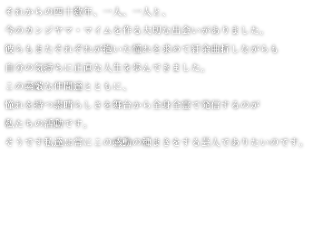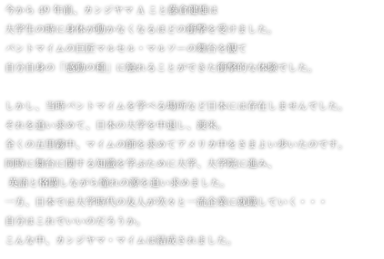 今のカンジヤマ・マイムを作る大切な出会いがありました。