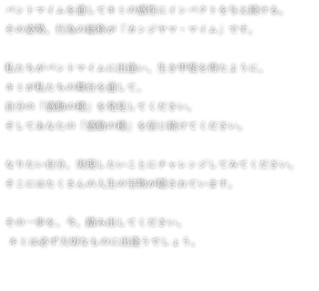 私たちがパントマイムに出逢い、生き甲斐を得たように、